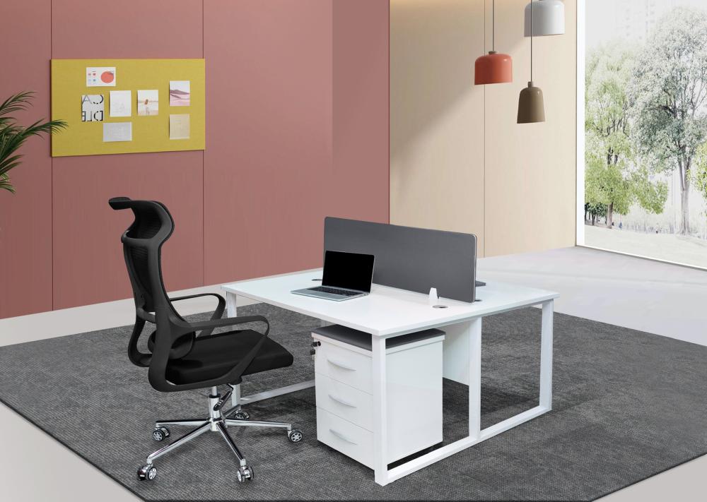 - تصميم بسيط: محطة عمل مكتبية ثنائية بتصميم عصري بسيط، تجمع بين اللونين الأبيض والرصاصي لتضفي الشعور بالراحة والاتساع.